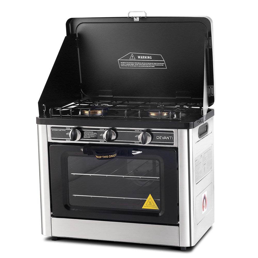 The unit has all the thoughtful and safety features that you'll come to expect from a quality product. Insulated cloth sleeve design, push-in piezo burner ignition, flame-out protection, built-in oven heat gauge, non-stick enamel cooking surface, a three-sided windscreen provided by the folding lid and side arms, fully-adjustable heat-control dials and many more great features. With its corrosion-proof and longlasting stainless steel construction, the Devanti Portable Gas Stove and Oven opens a host of cooking possibilities anywhere and anytime.