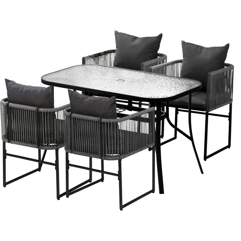 Elevate outdoor living with the Gardeon 5-Piece Outdoor Dining Set��perfect for sunny gatherings! The rust-proof powder-coated steel frame ensures lasting durability, while the all-weather synthetic fabric resists sun, rain, and stains. The set features 190g polyester rope chairs with sturdy steel frames for breathable comfort and stability, paired with a tempered glass table that includes a convenient parasol hole for shade. With floor protectors for added stability and a sleek, versatile design, this low-maintenance set transitions seamlessly from patio to indoor dining��ideal for relaxing meals under the open sky!