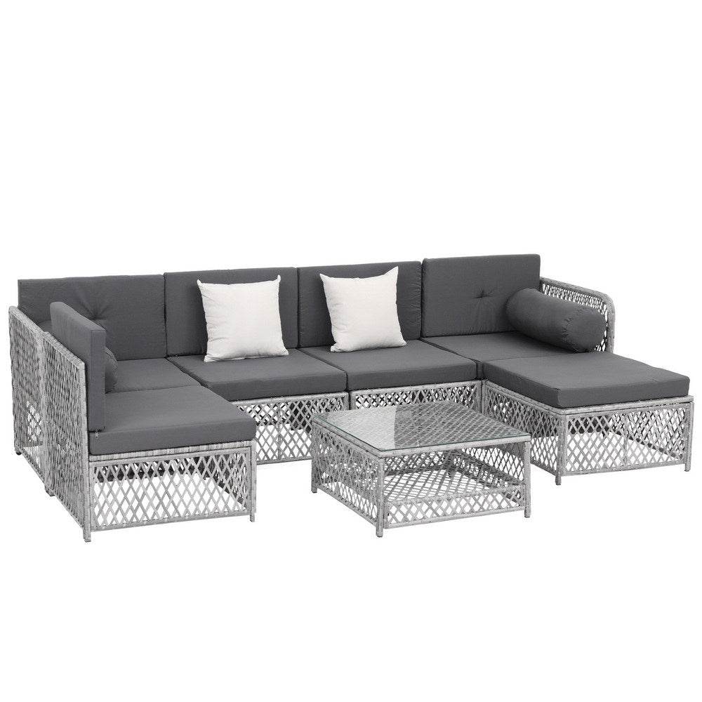 Looking to create a chic and gorgeous outdoor setting? The Gardeon 7-piece outdoor lounge set is a must purchase. It will liven up your outdoor space and help you achieve an elegant space where you can enjoy day and night and summer and winter. This 7-seater set comprises of three single sofas, two corner sofa, a ottoman and a matching centre table. You can arrange them in multiple ways to suit your space. Its beautiful and versatile design makes it perfect for both indoor and outdoor use. All the seat and back cushions come with thickness padding that ensures your comfort always. Additionally, our outdoor chairs features a lovely handwoven rattan weave for a touch of tropical charm and decorative effect, and the UV-resistant PE wicker makes this lounge set perfect for all-weather use. The large table with 5mm thick tempered glass top, and durable powder-coated frame ensures strength and durability. You can create a praise-worthy spot with just a little creativity that will wow your guests. Shop it for your home today.