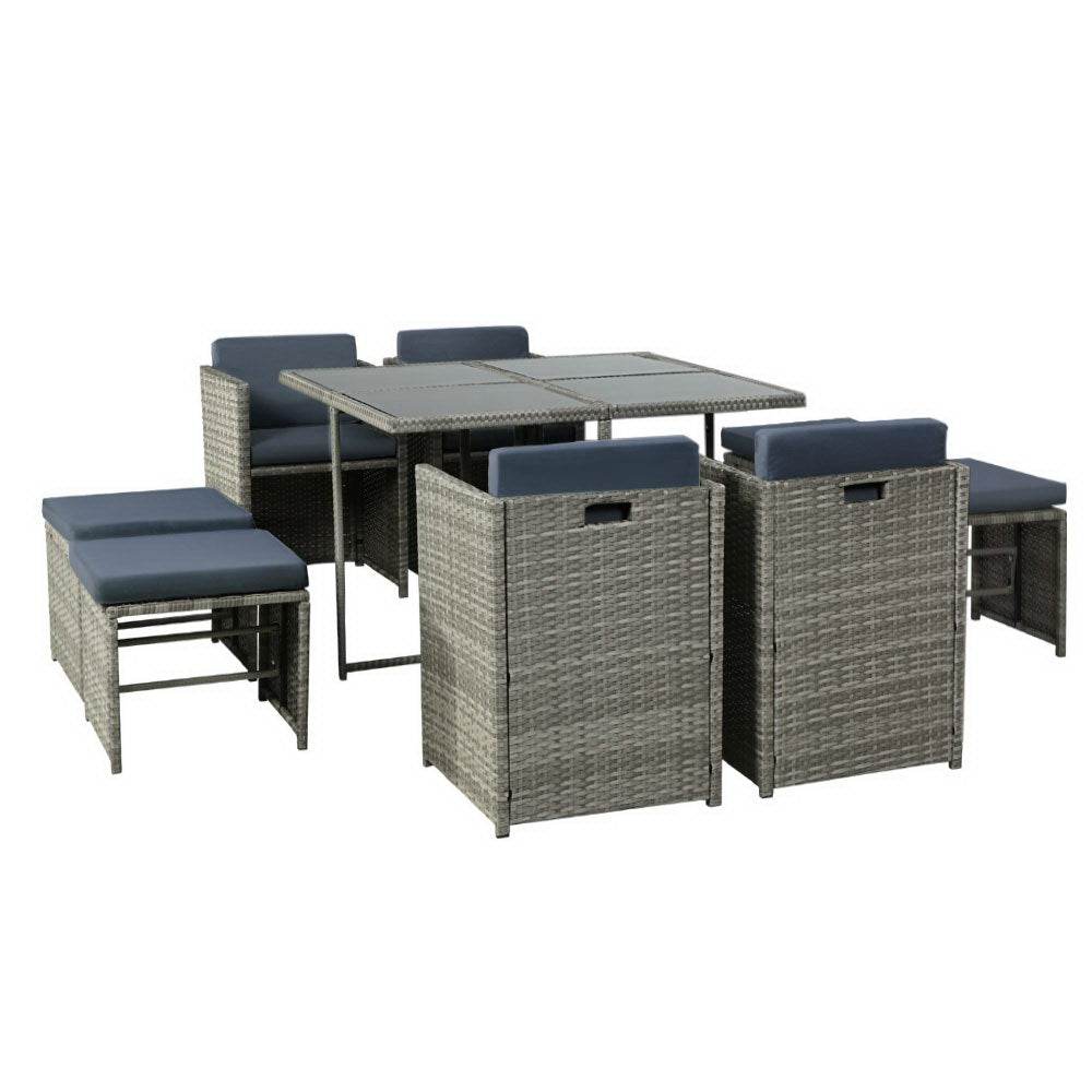 Looking to create a chic and gorgeous outdoor dining setting? The Gardeon 8-seater wicker outdoor dining set is a must purchase. It will liven up your outdoor space and help you achieve an elegant space where you can enjoy day and night and summer and winter. This 9-piece set comprises of four chairs, four ottomans, and a large table. It boasts an integrated design that helps save space. The ottomans can be pushed under the chairs when not needed. All the seat and back cushions come with thick, high-density soft padding that ensures your comfort always. Additionally, the removable cushion covers are water-resistant to suit different seasons. Furthermore, our outdoor set features a lovely wicker weave for a touch of tropical charm, and the UV-resistant PE wicker with weather-resistant steel frame is suitable for all-season use. The large table with thick tempered glass top, durable frame, and stable cross construction ensures strength, durability, and stability. This set also comes with a bonus water-resistant storage cover that offer protection from all seasons. Our wicker outdoor dining set will withstand the test of time. You can create a praise-worthy spot with just a little creativity that will wow your guests. Shop it for your home today.