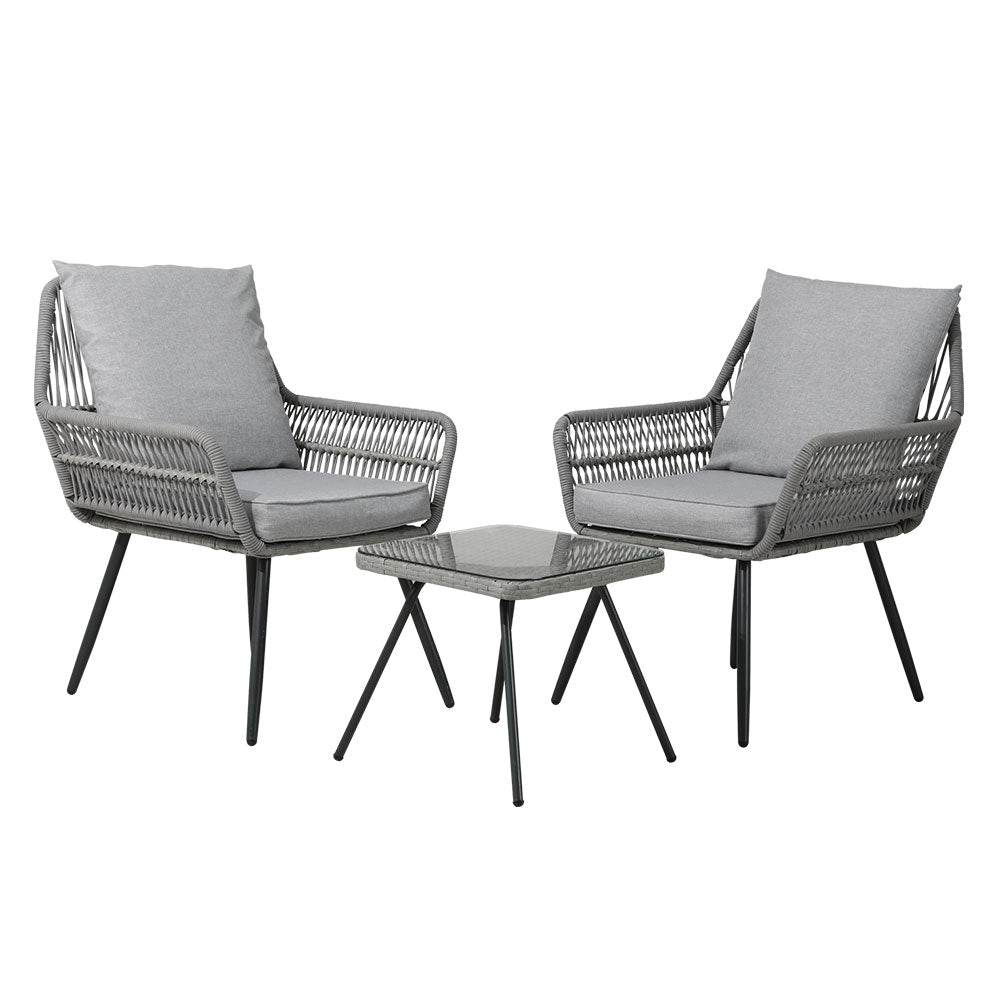 Experience the best the outdoors has to offer with this Gardeon 3-piece Outdoor Bistro Setting. Featuring two single chairs and a matching coffee table, this lounge set is perfect for sitting outside and watching the world go by in comfort and style. The set is made using powder-coated steel and meticulously woven wicker for rust and water resistance, while the outdoor cushions feature water and UV-resistant covers and thick 8cm high-density foam for comfort. It is easy to assemble and features non-slip feet to keep everything in its place. The coffee table features a durable tempered glass tabletop with a wicker border and additional bracing to hold all of your favourite drinks, reading materials or outdoor games. Maintenance is as easy as wiping down the furniture, and you can remove the cushion covers for even easier cleaning. So what are you waiting for? Make the most out of the beautiful weather with a Gardeon 3-piece Outdoor Bistro Setting.