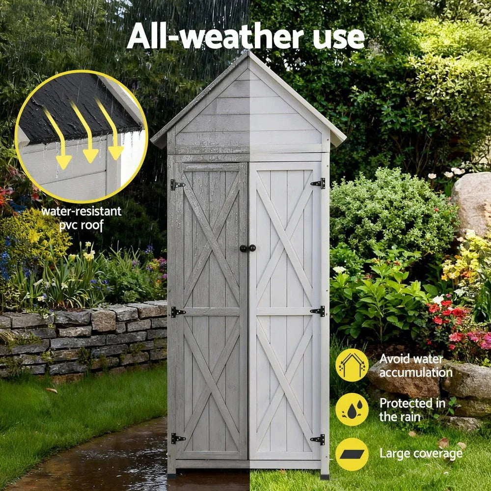 Organize with Gardeon's Spacious Outdoor Storage Cabinet �C featuring 3 shelves and ample storage for all your tools & gear. Built to last, this weatherproof outdoor cupboard combines solid fir wood and a durable PVC roof for all-season protection. The 2cm thick wood resists cracks and corrosion, ensuring long-lasting use. Easy assembly with numbered parts, full hardware, and a clear guide. Versatile as a garden cupboard, balcony storage, or outdoor cabinet, all with a sleek wood finish.