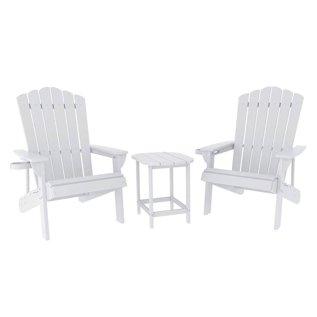 Upgrade your outdoor space with this durable HDPE 3-piece set��perfect for patios, gardens, or poolside relaxation! The side table features weatherproof, fade-resistant HDPE, a 91kg load capacity, water-draining slats, and safety-curved edges��zero maintenance, just wipe clean. Pair it with two Gardeon Adirondack chairs, designed for comfort with 103�� reclined backrests, wide armrests, and 11cm cup holders. Made of crack-resistant HDPE, each chair supports 170kg with reinforced triangular frames and rustproof stainless steel screws. Both chairs and table are weatherproof, fade-resistant, and easy to assemble (tools included). Customize with paint or enjoy hassle-free cleaning (soap + water). Ideal for outdoor lounging!