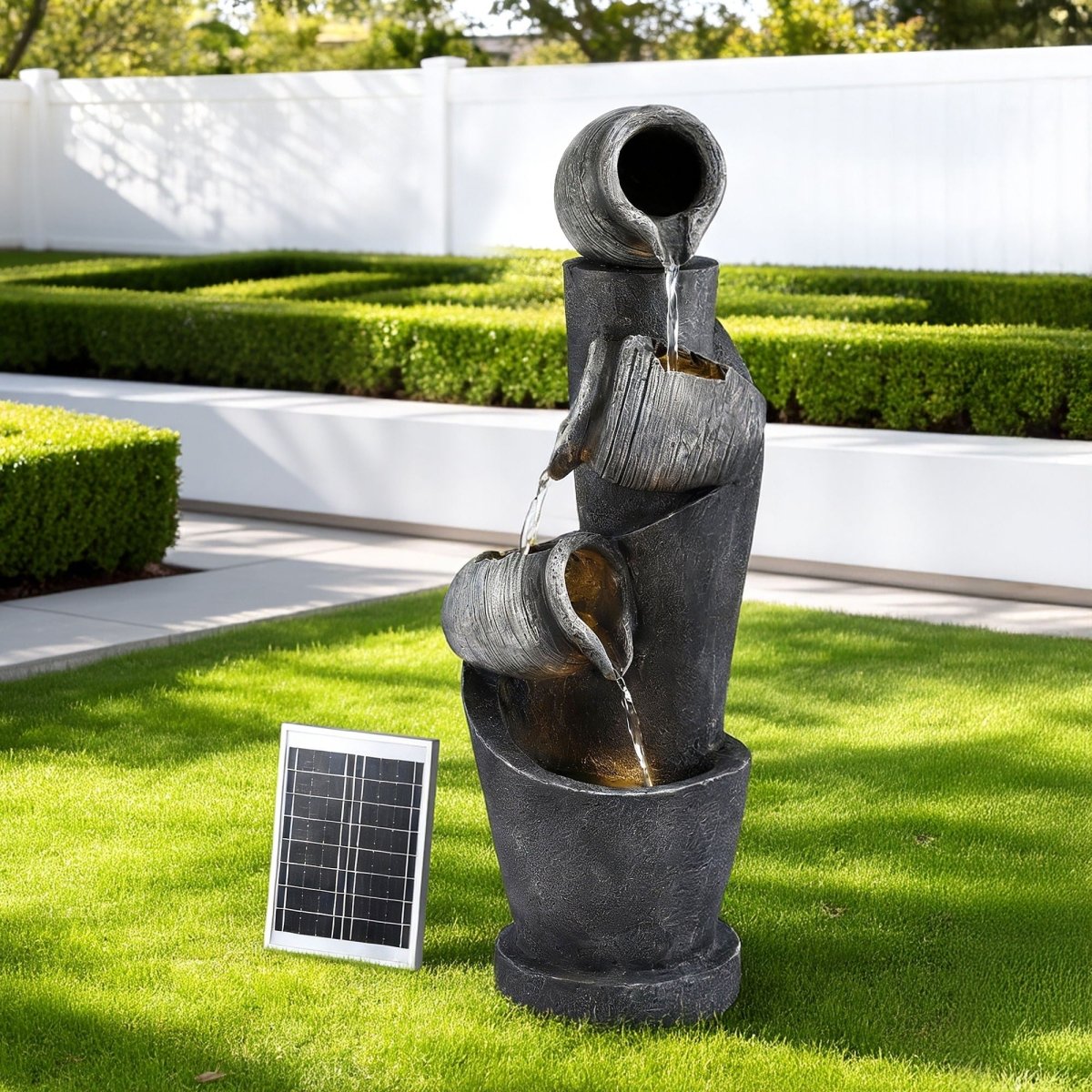 Enhance your space with this classic cascading solar-powered fountain. Featuring gorgeous sculptural details, it includes an energy-efficient solar panel, lithium battery, and durable water pump for outdoor or indoor use. The adjustable water flow and underwater LED lighting create a stunning ambiance day or night. With easy installation and no wiring required, this powerful, eco-friendly system is the perfect decorative garden upgrade. All essential components are included.