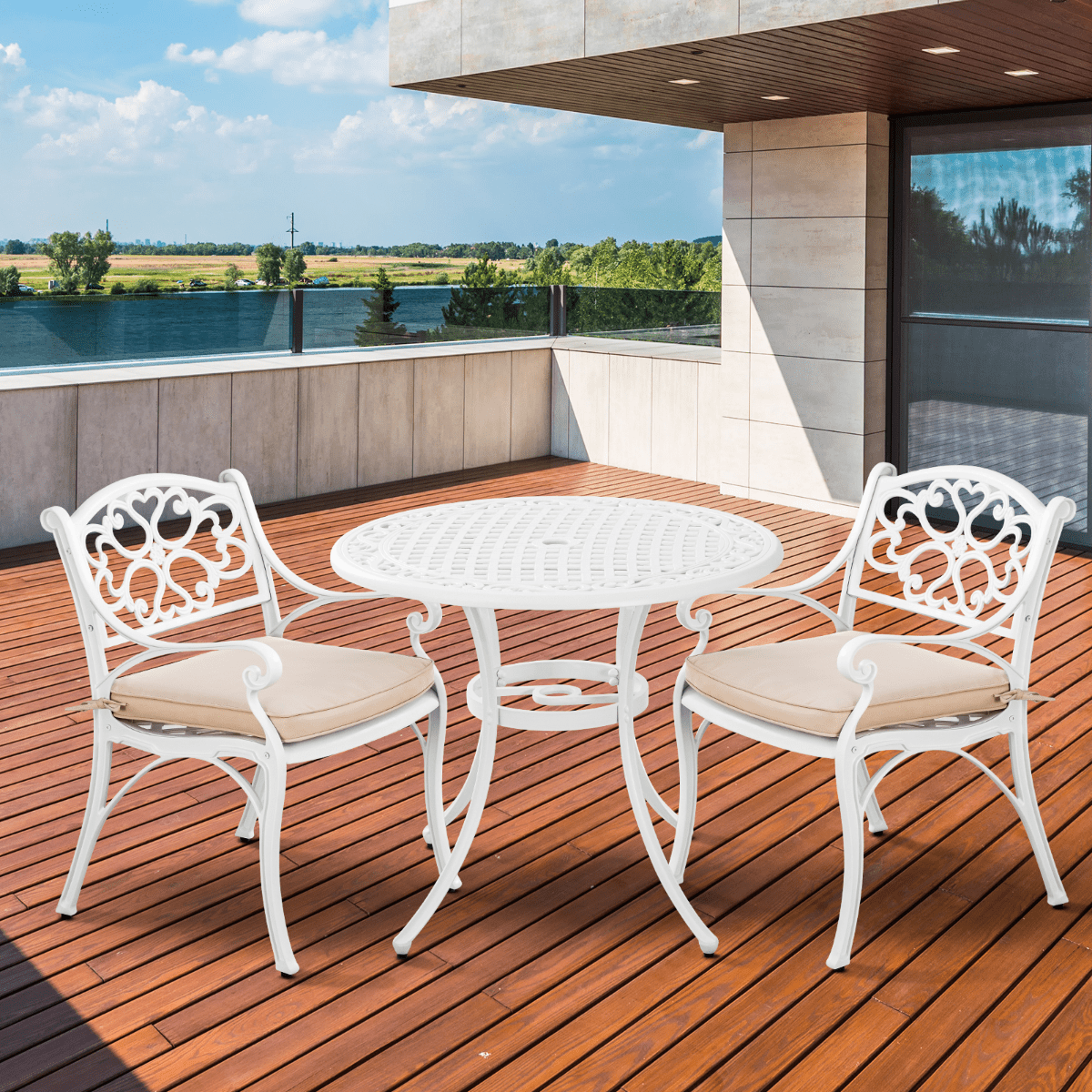 The Marco 3 Piece Cast Aluminium setting is lightweight but very sturdy. It is great on a balcony in a courtyard or in that cozy corner of your garden where you like to take a cup of tea or a cocktail with a friend.
